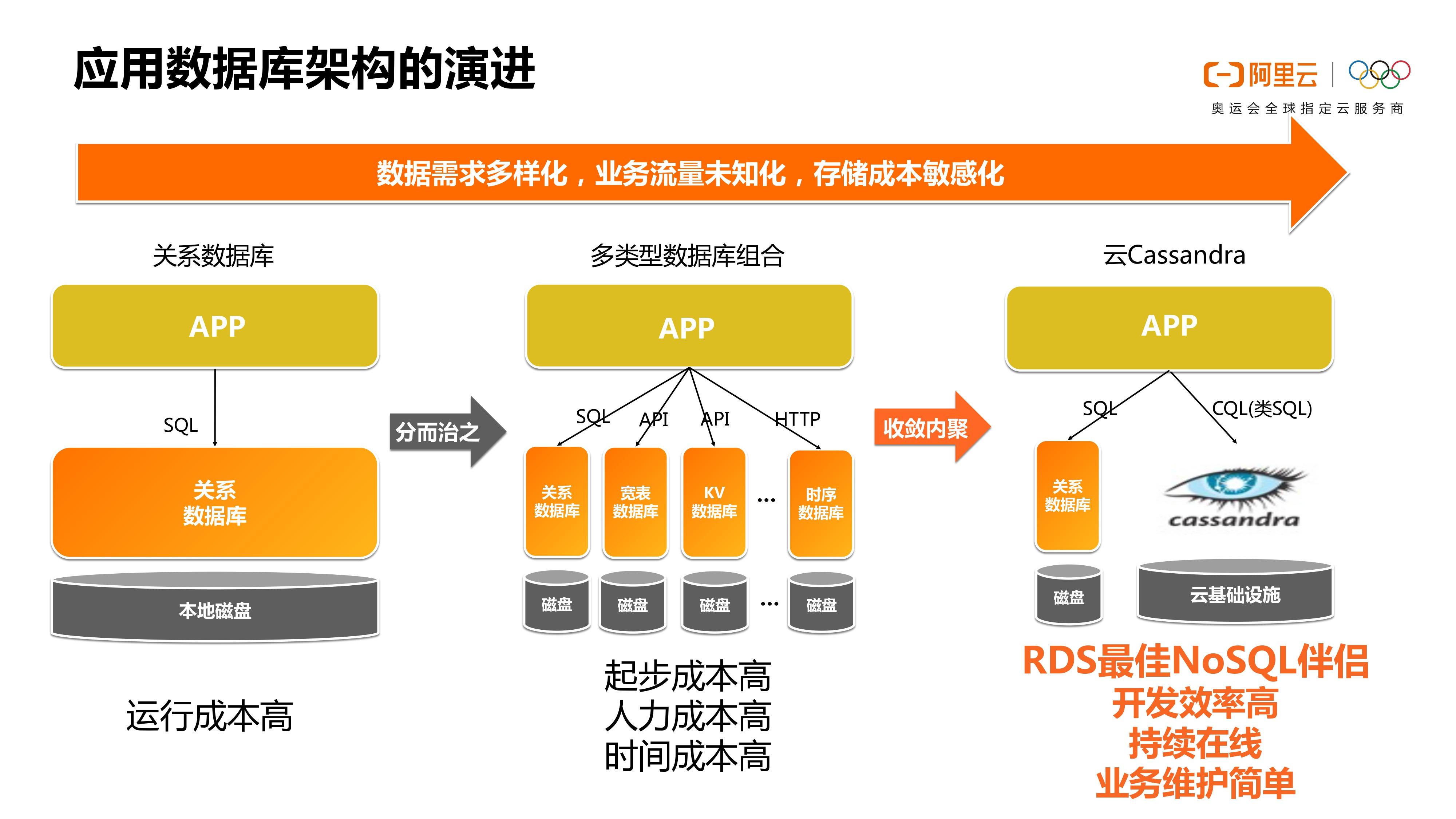 随着技术的发展,其实越到后面你就会发现除了要一个RDS之外,还需要一个NoSQL的大数据的数据库。我们Cassandra就是为了这种场景而诞生的。