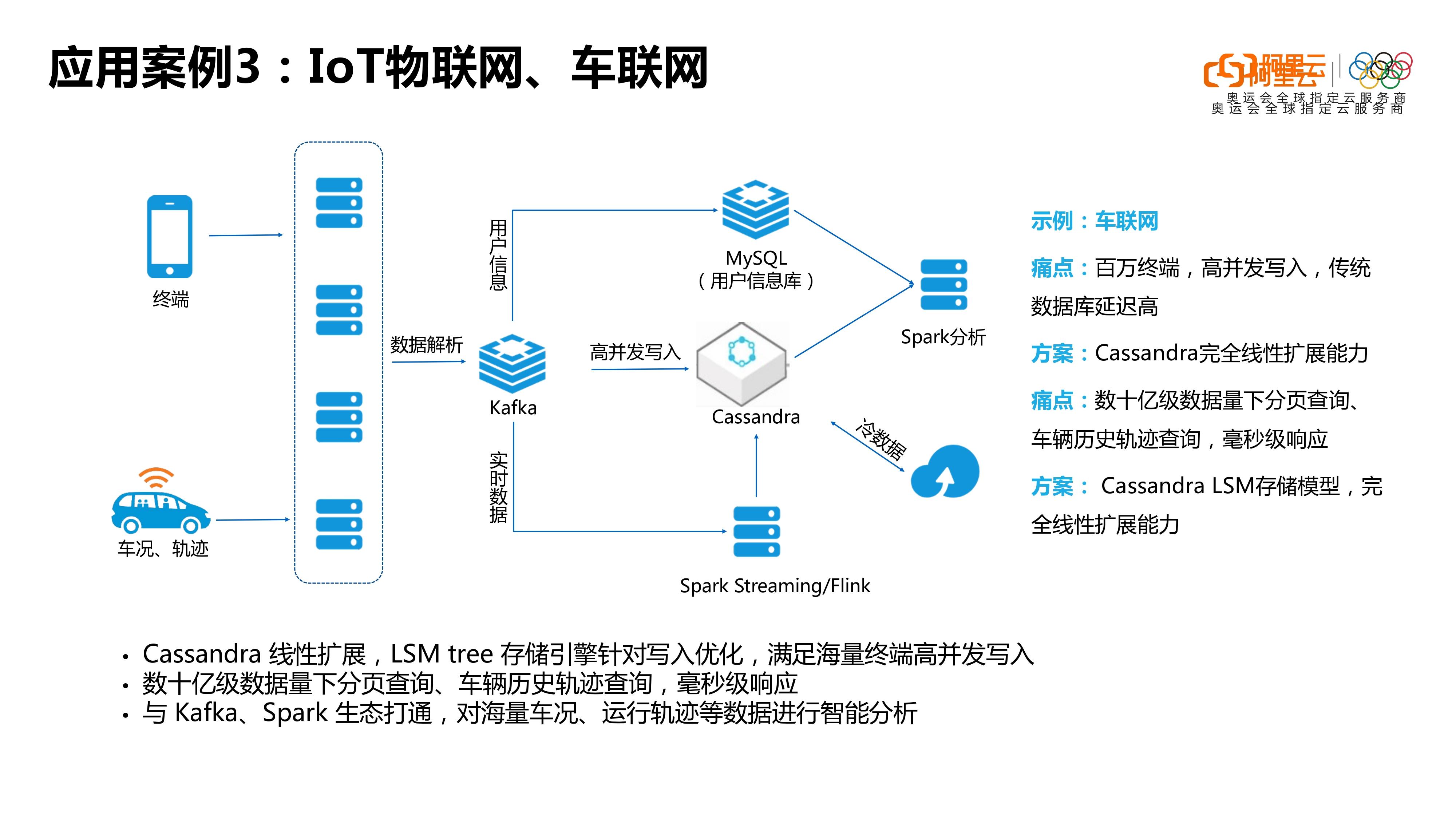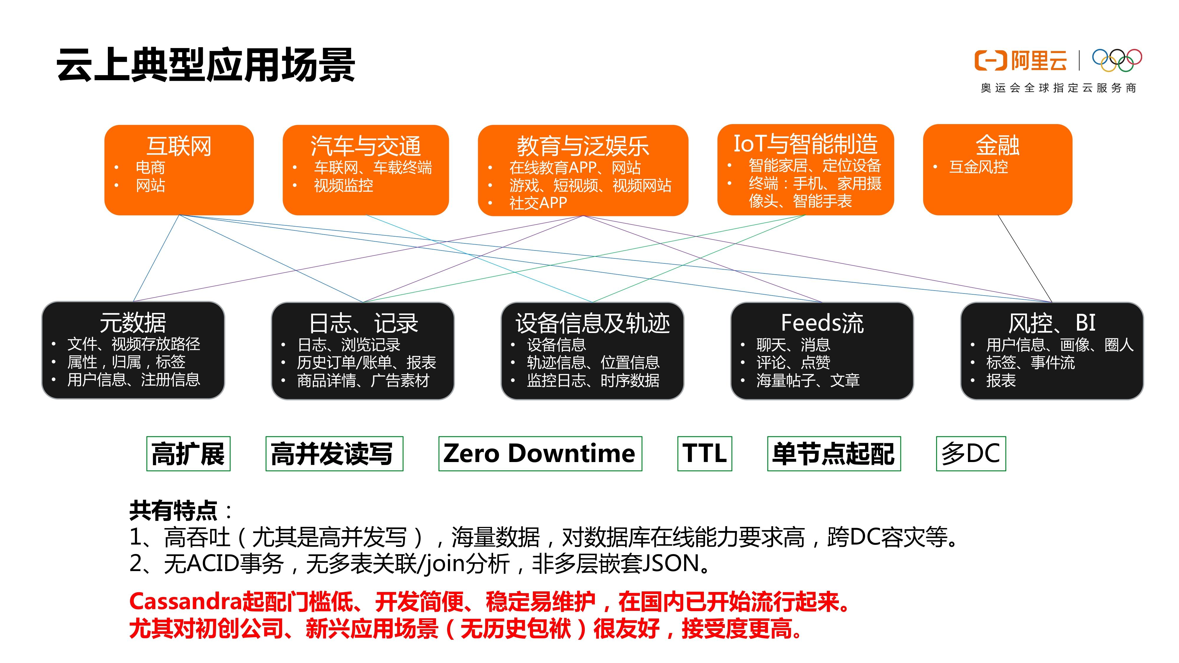 第三点的话,教育和泛娱乐这一块。也是因为今年的疫情,我们见证了越来越多的这种网上学习授课的公司的发展,它们其实也有很多场景可以用到我们数据库的。还有一些游戏,其实2020年的游戏也是爆炸式的一个增长,然后包括短视频网站,社交类的这种APP是吧。类似于这种场景,其实在阿里云Cassandra可能都有这种用户的存在。