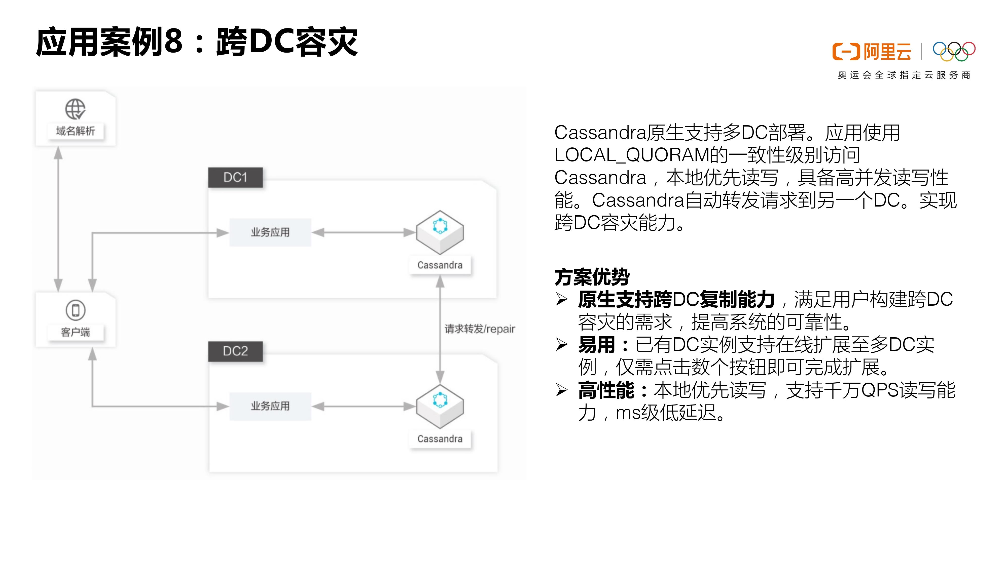 第三点就是持续在线能力,它其实有一个非常好的功能。比如我在3副本QUORUM读写这种模式下,单节点故障和单节点下线其实对整个集群没有一个太大的影响,应用甚至都感知不到这个故障,这是它很好的在线能力。同时它还有原生的跨DC容灾的能力,这些都是非常好用的一些特性。
