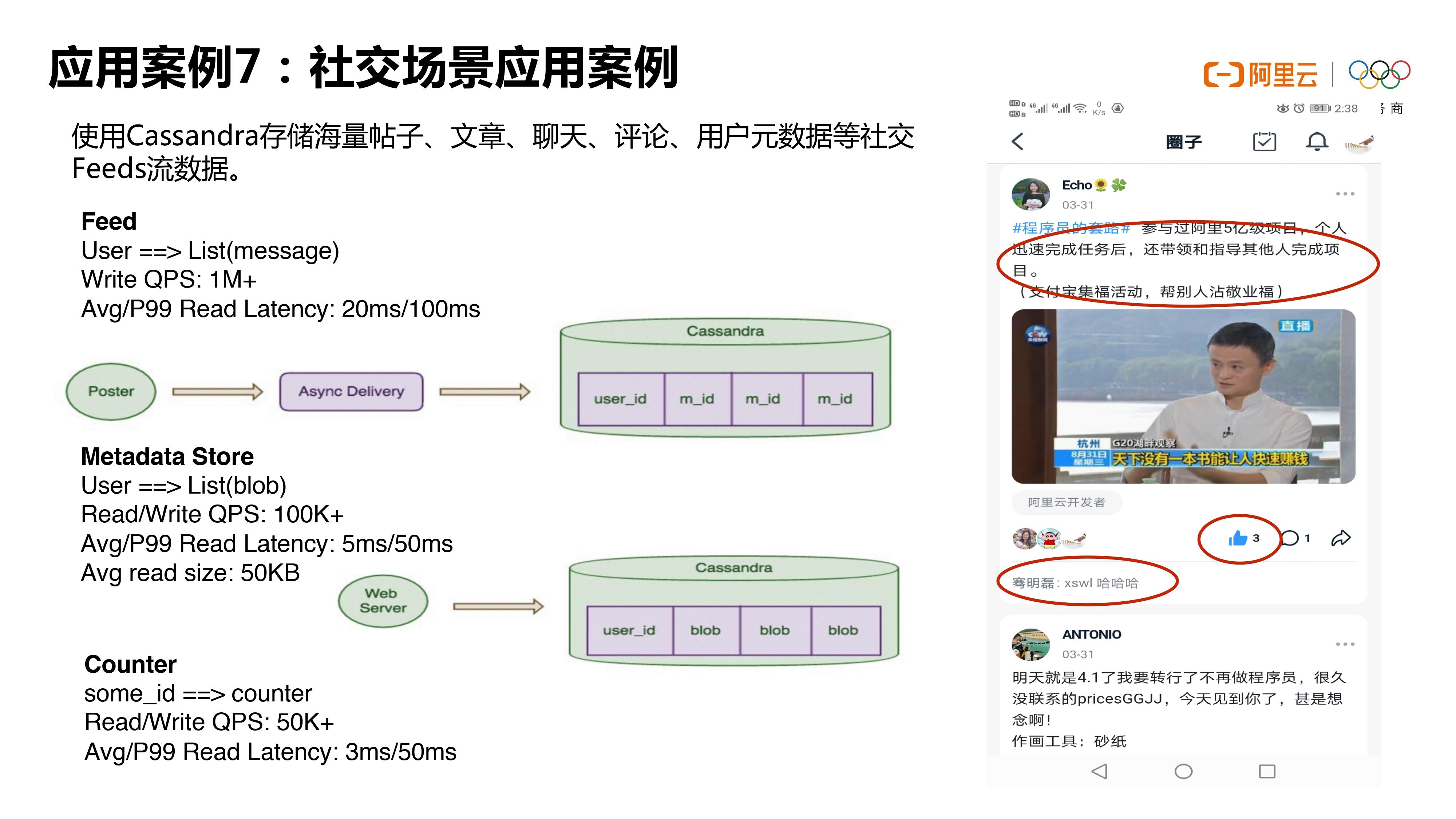 还有第四块是Cassandra一个非常经典的场景,从一些Feeds流,比如说有一些这种聊天室的应用。那么聊天室里面有大量的这种聊天记录,类似的还有一些消息数据、点赞评论,这些其实都可以存到Cassandra里面来。