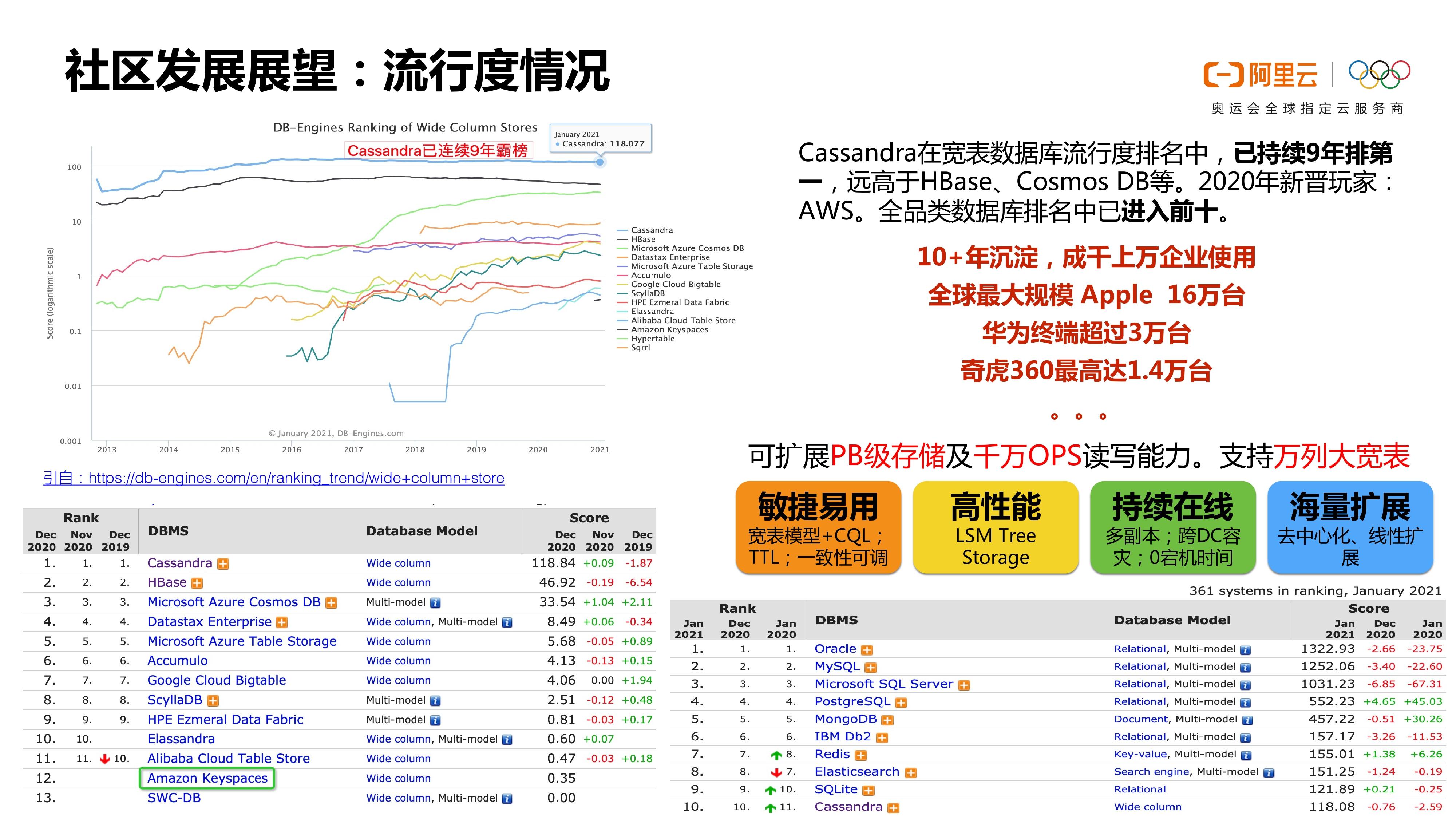 接下来是展望,其实Cassandra在宽表数据库领域其实已经连续9年霸榜了。大家可以看到这个数据库本身是一个非常好的非常优秀的数据库产品,它从2012年开始到现在流行一直都是第一的。所以大家可以看到它在国际上的地位,它其实是非常流行的一个数据库。