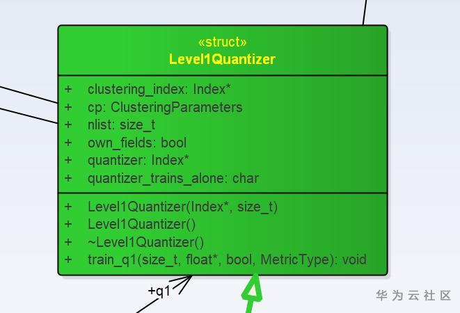 在图一中还有两个被标记为淡绿色的类ProductQuantizer和ScalarQuantizer值得大家关注下,在结构上,这两个类均没有派生的子类,并且所有其他的类与他们的关系均为“hold a”关系,很纯粹的工具类。从其命名中的Quantizer(量化器)后缀可知,这两个工具类的作用是将“连续或稠密”的数据进行“离散或稀疏化”,简单来说就是进行聚类的操作,就像我们把18岁以下的称为少年,18~50岁的称为中年一样,我们把具体年龄量化成年龄段的过程就是一个聚类的过程。从图一中还可以看到,带有Quantizer后缀的类还有四个:MultiIndexQuantizer、MultiIndexQuantizer2、IndexScalarQuantizer和Level1Quantizer。其中前三个均是通过对ProductQuantizer或ScalarQuantizer的包装来实现Quantizer的功能,没什么稀奇的地方,但最后一个Level1Quantizer类竟然是包装了两个Index类,而且其中一个Index类的属性名还是quantizer,如下图所示。