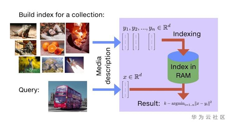 首先,我们来看一下Faiss最主要的功能:相似度搜索。如下图所示,以图片搜索为例,所谓相似度搜索,便是在给定的一堆图片(下图中左上角的图集)中,寻找出我指定的目标(下图中左下角的巴士图片)最像的K张图片,也简称为KNN(K近邻)问题。