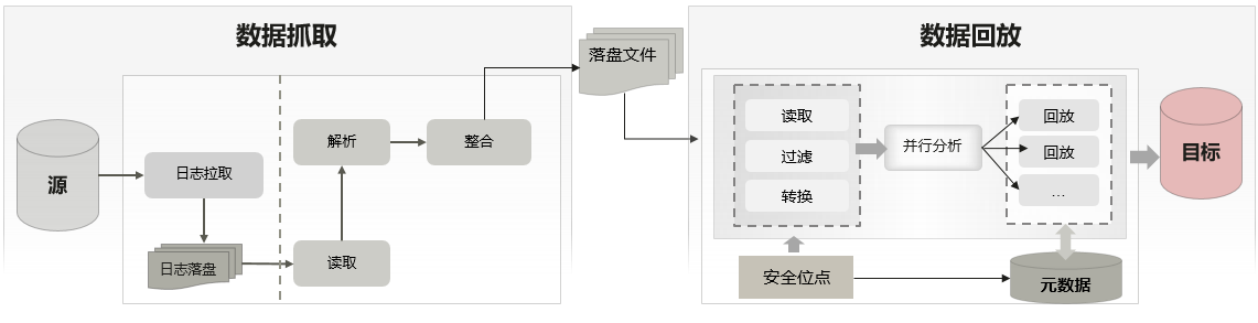 DRS的增量同步架构主要分为3个部分,分别是数据抓取、落盘文件和数据回放。