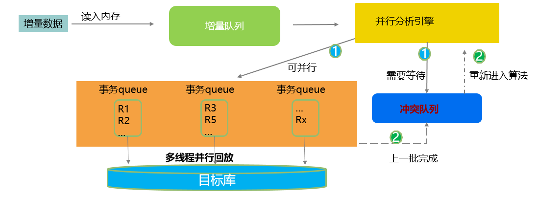首先从DRS的落盘文件中读取增量数据,按顺序放入一个队列中,并行分析引擎会从队列中获取每一条数据,并根据其主键信息判断是否存在数据冲突,对于没有冲突的数据说明可以并行去执行,则把这些数据分散到多个线程队列中,当线程队列中的数据量达到设定的阈值时,这批数据会作为一个事务在目标库执行。对于有冲突的数据,则把这条数据放到冲突队列,等待线程把上一批数据执行完成后,再次进入并行分析引擎判断是否存在冲突。