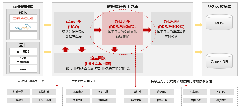 为了实现以上业务切换需要满足的条件,华为云提供了数据库迁移的整体解决方案,通过语法迁移(UGO),DRS-数据迁移,DRS-数据校验和DRS-流量回放4个工具产品形成了整个迁移过程的闭环。