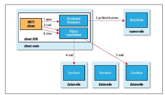 存储着文件起始块的 DataNode 地址的 DFSInputStream 随即连接距离最近的 DataNode,通过对数据流反复调用 read() 方法,可以将数据从 DataNode 传输到客户端;