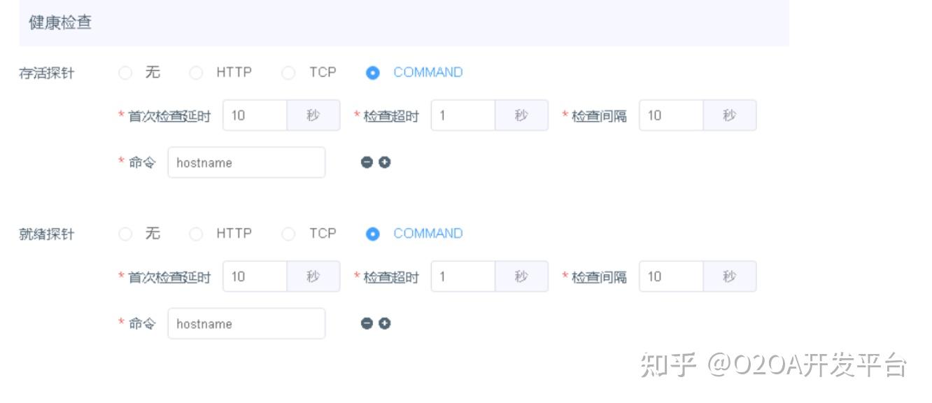 3.3、将康检查设置,目前设置的是主机命令检查,由于o2oa启动需要时间,后续可以根据启动时间设置首次检查延迟时间,并将主机命令检查调整为http检查。