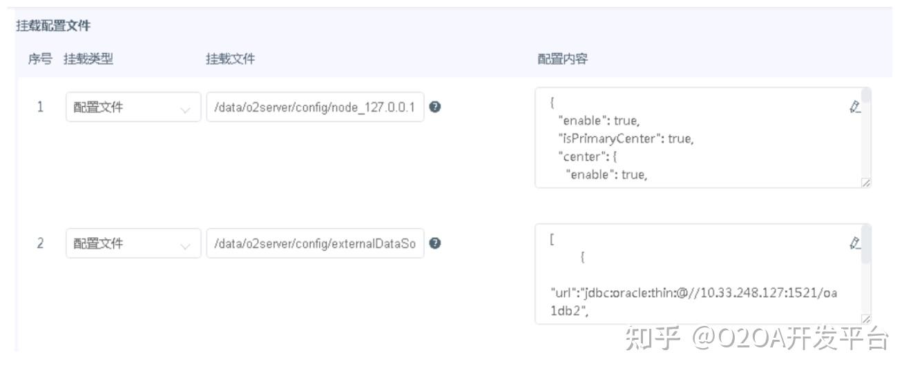 3.2、挂载配置文件node_127.0.0.1.json、externalDataSources.json (将基础服务器配置文件和数据库文件放入PAAS平台管理。在容器启动后,应用启动前PAAS平台会将配置文件写入/data/o2oaserver/config目录下)