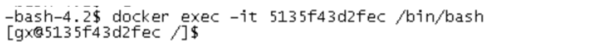♦进入容器 命令:docker exec -it 容器号 /bin/bash ,实际命令如下:(能够看到控制台已经切换为gx用户)