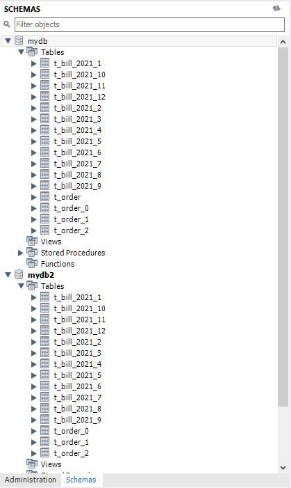 CREATE TABLE `t_bill_2021_1` ( `order_id` bigint(20) NOT NULL COMMENT '订单id', `user_id` int(20) NOT NULL COMMENT '用户id', `address_id` bigint(20) NOT NULL COMMENT '地址id', `status` char(1) DEFAULT NULL COMMENT '订单状态', `create_time` datetime DEFAULT NULL COMMENT '创建时间', PRIMARY KEY (`order_id`) USING BTREE ) ENGINE=InnoDB DEFAULT CHARSET=utf8mb4 COLLATE=utf8mb4_0900_ai_ci; CREATE TABLE `t_bill_2021_2` ( `order_id` bigint(20) NOT NULL COMMENT '订单id', `user_id` int(20) NOT NULL COMMENT '用户id', `address_id` bigint(20) NOT NULL COMMENT '地址id', `status` char(1) DEFAULT NULL COMMENT '订单状态', `create_time` datetime DEFAULT NULL COMMENT '创建时间', PRIMARY KEY (`order_id`) USING BTREE ) ENGINE=InnoDB DEFAULT CHARSET=utf8mb4 COLLATE=utf8mb4_0900_ai_ci; -- 省略.... CREATE TABLE `t_bill_2021_12` ( `order_id` bigint(20) NOT NULL COMMENT '订单id', `user_id` int(20) NOT NULL COMMENT '用户id', `address_id` bigint(20) NOT NULL COMMENT '地址id', `status` char(1) DEFAULT NULL COMMENT '订单状态', `create_time` datetime DEFAULT NULL COMMENT '创建时间', PRIMARY KEY (`order_id`) USING BTREE ) ENGINE=InnoDB DEFAULT CHARSET=utf8mb4 COLLATE=utf8mb4_0900_ai_ci;
