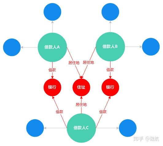 同一个人利用多个身份去申请贷款,详细见下图:虽然贷款人A、贷款人B、贷款人C之间没有直接的关系,但通过知识图谱可以看出三者之间都共享某一部分信息,存在一定的组团骗贷风险。