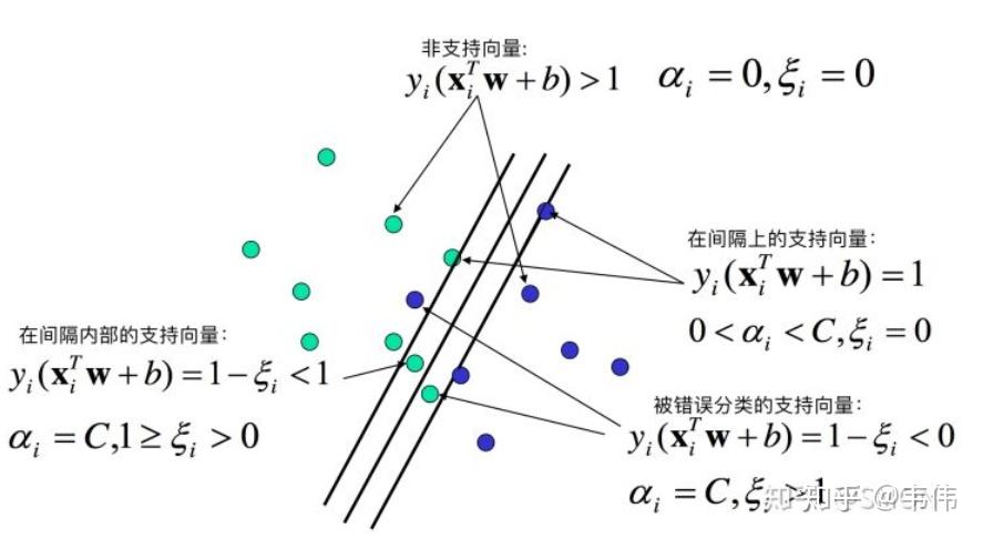 - 线性支持向量机中, 支持向量是距离划分超平面最近的样本, 落在最大间隔边界上。