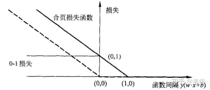 那么这个松弛变量怎么计算呢,最开始试图用0,1损失去计算,但0,1损失函数并不连续,求最值时求导的时候不好求,所以引入合页损失(hinge loss):