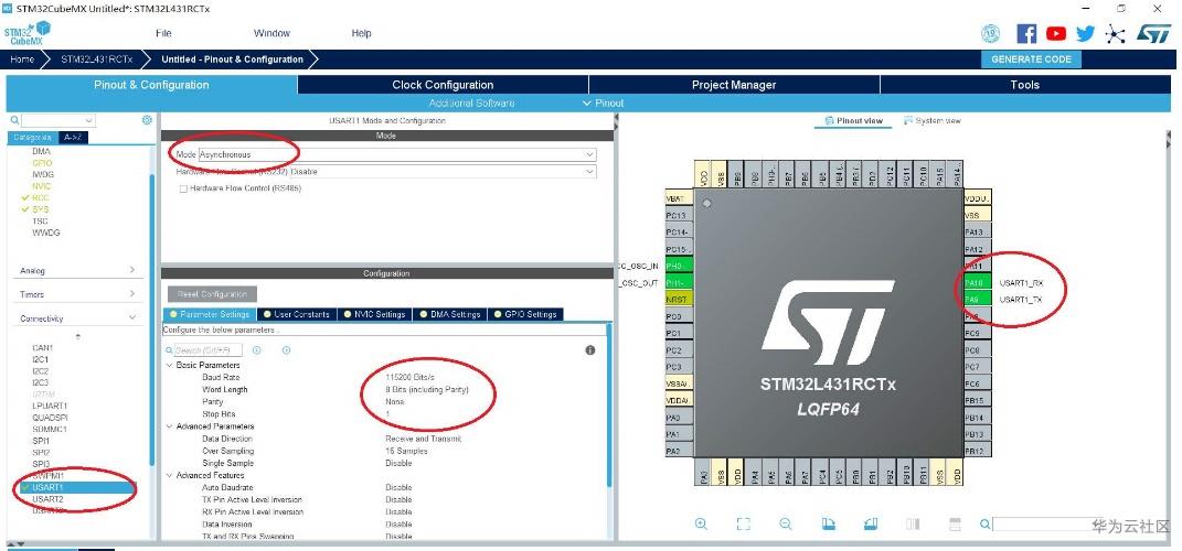 使用USART,模式为异步,波特率为115200,无硬件流控制
