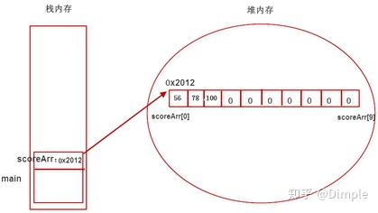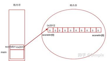 在堆内存中分配连续的10个空间,每个空间大小为4字节(int类型),每个元素的默认值是0,并将数组的首地址赋给scoreArr变量。各个元素分别用scoreArr[0]、scoreAr[1]