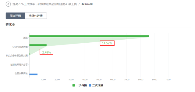 点击单篇图文详情分析还可查看公众号打开率、一次二次传播率、阅读来源以及阅读趋