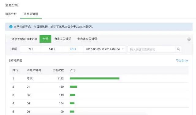 消息关键词分析可分别查询 7天、14天、30天里,前200名的消息关键词是什么。我们经常习惯在文章添加一些关键字用户在后台进行回复,关键词回复分析有助于得出用户与平台互动的频率、文章的回复率,对分析文章的好坏有很好的帮助。除此之外,通过关键词的分析,从而找出用户的主要疑惑点,做好FAQ,通过FAQ提高客服的工作效率。