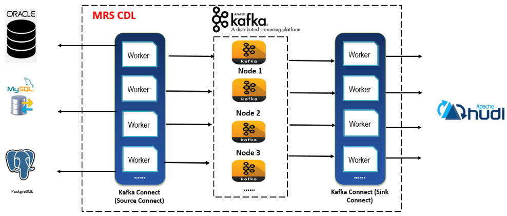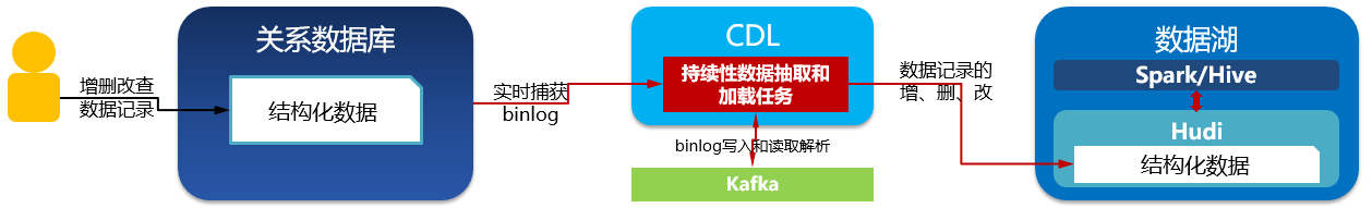 实时数据接入工具(如CDL),可以实时捕获关系数据库的binlog日志,保存在消息队列如Kafka,并支持实时解析binlog日志生成增删改命令来操作数据湖的数据记录,实现关系数据库的数据实时入湖,入湖时效性在秒级或分钟级,一般小于15分钟。以下是实时数据接入工具(CDL)的功能架构图: