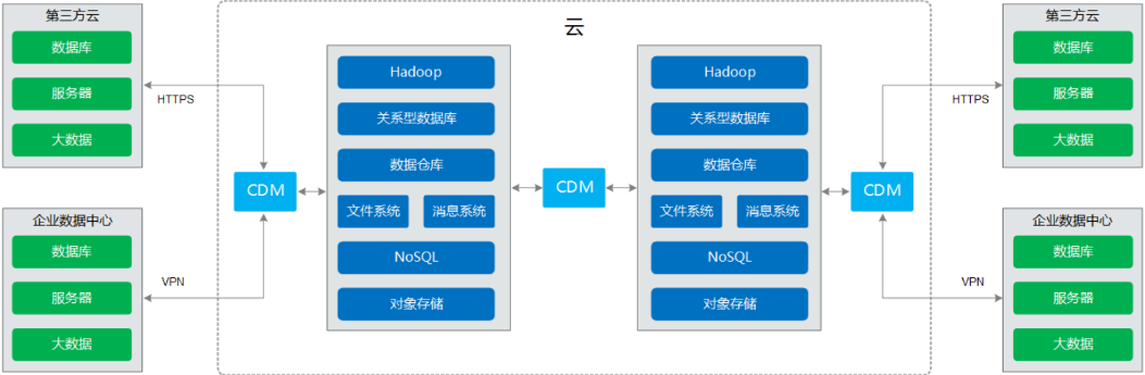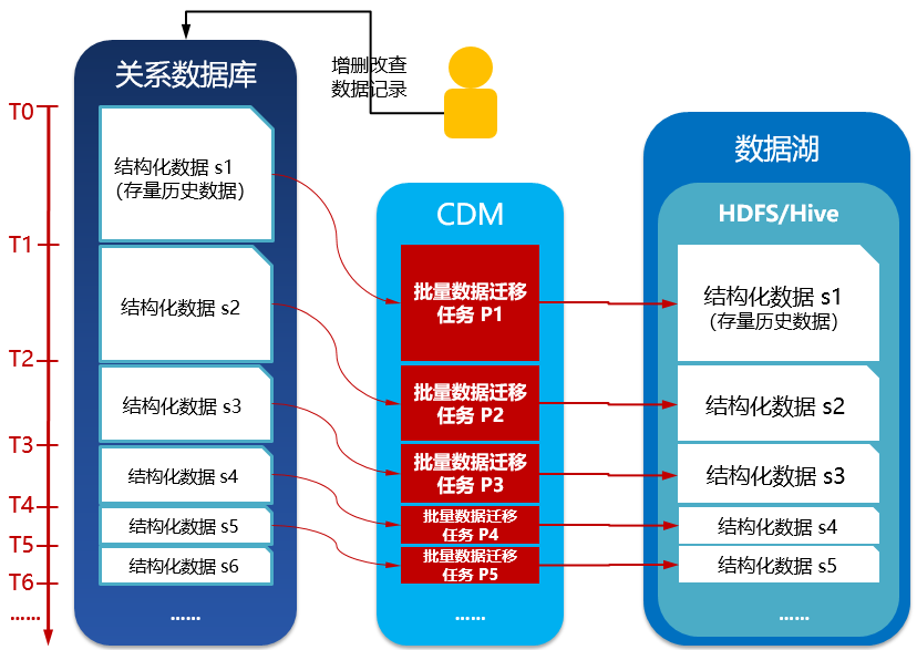 批量数据迁移工具,可以一次全量、一次全量+批次增量的方式将数据从关系数据库的数据迁移到数据湖,往往入湖时效性(从数据产生到数据进入数据湖贴源层)在10多分钟或更长,如15分钟左右,取决于批次增量迁移任务的时间间隔。以下是批量数据迁移工具(CDM)的功能架构图: