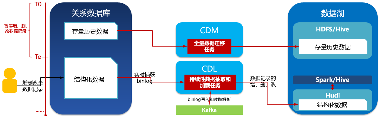 注:存量数据入湖作业运行时间较久,视存量历史数据量、网络带宽、入湖作业吞吐量等因素决定。在此期间,关系数据库由于不断接受新写入,累积较大量的新数据。