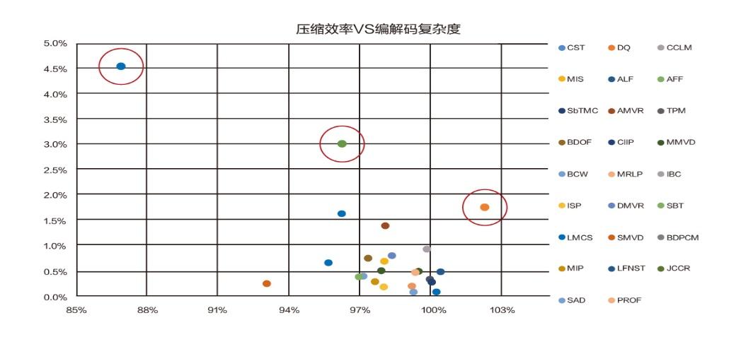 图中还有三个用红圈标出来的工具,这是VVC 中公认trade off 比较好的三个工具点。蓝色的是ALF,这是大家比较熟悉的自适应环路滤波,其实它在H.265的时代就已经有了, H.266 将它引入标准中;绿色的是仿射运动预测,这个主要是由华为提出的;橙色的是量化技术。