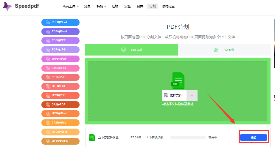 方法1:最简单的方法当然还得是在线转换,打开speedpdf在线转换工具后,选择PDF分割并上传PDF文档后,点击文档后面的转换;