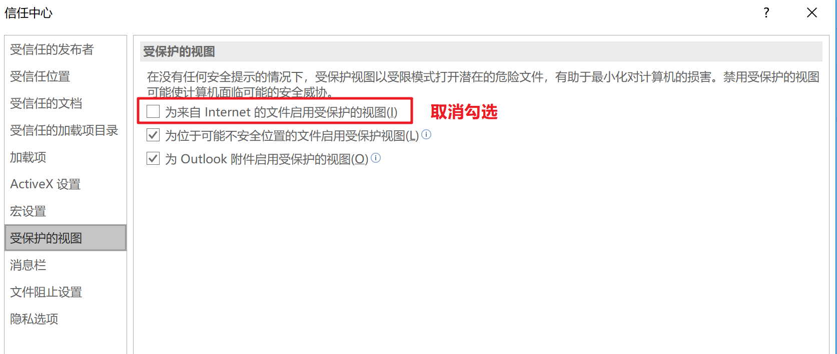 - 依次点击【文件】-【选项】-【信任中心】-【信任中心设置】-【受保护的视图】,取消勾选【为来自Internet的文件启用受保护的视图】
