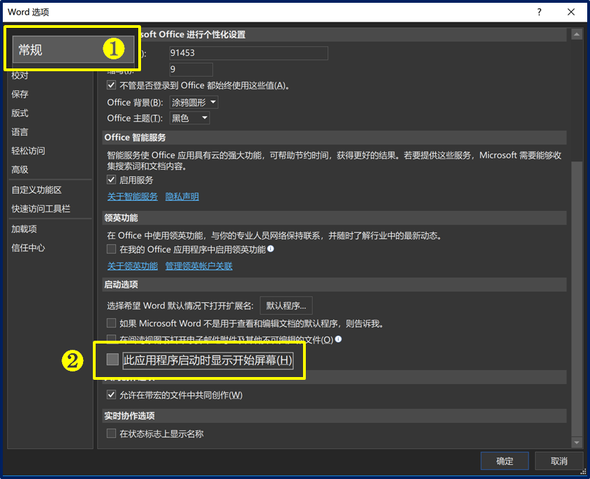 ❷ 依次单击【选项】→ 【常规】,在启动选项找到【此应用程序启动时显示开始屏幕】,取消勾选即可!