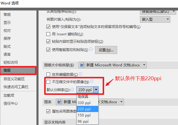 在Word页面左上角,选择【文件】—【选项】—【高级】—【图片大小和质量】