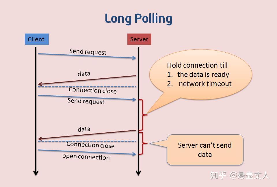 Browser/UA发送Get请求到Web服务器,这时Web服务器可以做两件事情,第一,如果服务器端有新的数据需要传送,就立即把数据发回给Browser/UA,Browser/UA收到数据后,立即再发送Get请求给Web Server;第二,如果服务器端没有新的数据需要发送,这里与Polling方法不同的是,服务器不是立即发送回应给Browser/UA,而是把这个请求保持住,等待有新的数据到来时,再来响应这个请求;当然了,如果服务器的数据长期没有更新,一段时间后,这个Get请求就会超时,Browser/UA收到超时消息后,再立即发送一个新的Get请求给服务器。然后依次循环这个过程。