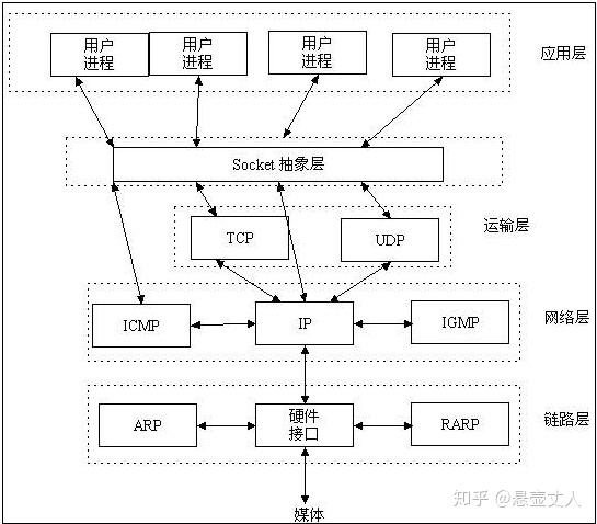 主机 A 的应用程序要能和主机 B 的应用程序通信,必须通过 Socket 建立连接,而建立 Socket 连接必须需要底层 TCP/IP 协议来建立 TCP 连接。建立 TCP 连接需要底层 IP 协议来寻址网络中的主机。我们知道网络层使用的 IP 协议可以帮助我们根据 IP 地址来找到目标主机,但是一台主机上可能运行着多个应用程序,如何才能与指定的应用程序通信就要通过 TCP 或 UPD 的地址也就是端口号来指定。这样就可以通过一个 Socket 实例唯一代表一个主机上的一个应用程序的通信链路了。