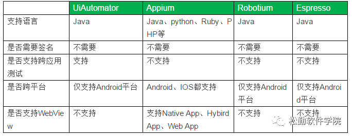 4、UiAutomator也是Android提供的自动化测试框架,基本上支持所有的Android事件操作,对比Instrumentation它不需要测试人员了解代码实现细节(可以用UiAutomatorviewer抓去App页面上的控件属性而不看源码)。基于Java,测试代码结构简单、编写容易、学习成本,一次编译,所有设备或模拟器都能运行测试,能跨App(比如:很多App有选择相册、打开相机拍照,这就是跨App测试)。缺点是只支持SDK 16(Android 4.1)及以上,不支持Hybird App、WebApp。