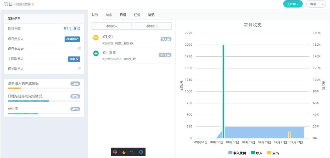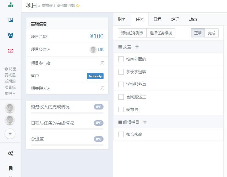以我之见,项目管理应该专注于项目本身,并且围绕这些项目进行周边的管理,例如任务,协作,财务,等等,这些情况的使用场景有程序员接私活,自由职业者,外包团队等。