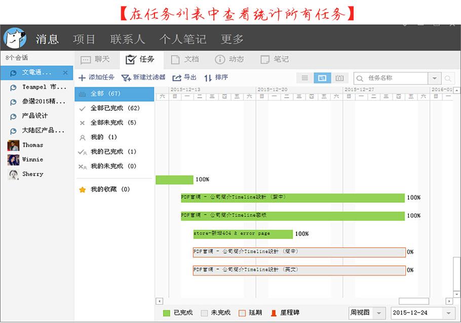 不仅如此,简单的『进度』概念也做得不错,用了进度条的方式来显示项目各项指标的完成度,如果系统检测到超期未完成等特殊情况,还会在进度条旁边弹出文字提示。这个可以让任务管理者清楚自己目前最应该做的是什么。