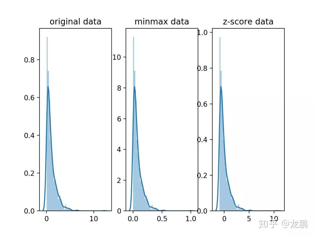 以上都是线性变换,对输入向量$X$按比例压缩再进行平移,操作之后原始有量纲的变量变成无量纲的变量。不过它们不会改变分布本身的形状,下面以一个指数分布为例: