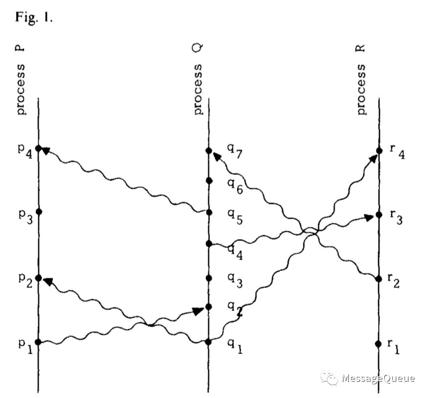 上图中,进程P中的事件顺序为p1->p2->p3->p4(时间推断)。而因为p1给进程Q的q2发了消息,那么p1一定在q2之前(因果推断)。但是无法确定p1和q1之间的顺序关系。