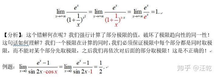 做一个系统的说明:我们在求极限的过程中,一定要注意到一点,我们“含有极限因子的因式”同剩下的“含有极限因子的因式整体”(常数不用管,比如第一题的底数为e,只有指数部分才有含极限因子的因式)为乘除关系,且其取极限之后的结果是一个“非零常数”,我们通常可以直接将其求出极限;如果我们对某个因式求了极限发现还含有极限因子,我们此时是不能够进行计算部分因式的极限的!