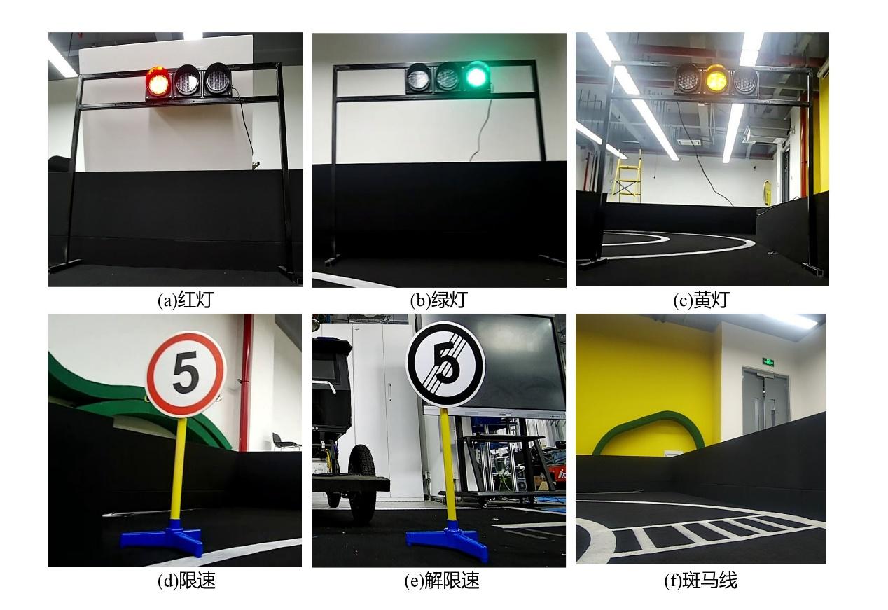 本次大赛涉及6类目标的检测识别:红灯、绿灯、黄灯、限速标识牌、解限速标识牌、斑马线,如图3‑2所示。无人车在运行过程中,对目标采集的图像涉及不同的视角和距离,而且比赛场地光强未知,所以对于目标检测任务,要充分考虑到目标不同视角的刚体形变、不同距离的尺度变化、不同环境光强的变化以及无人车运行中的运动模糊。无人车根据检测的结果做出相应决策和控制,对目标检测的精度要求很高,一旦误检或漏检,小车的控制就会出错,而且小车在赛道上快速运行,所以对目标检测的速度也要求较高,一但小车看见目标,需要快速输出检测结果。
