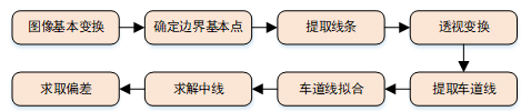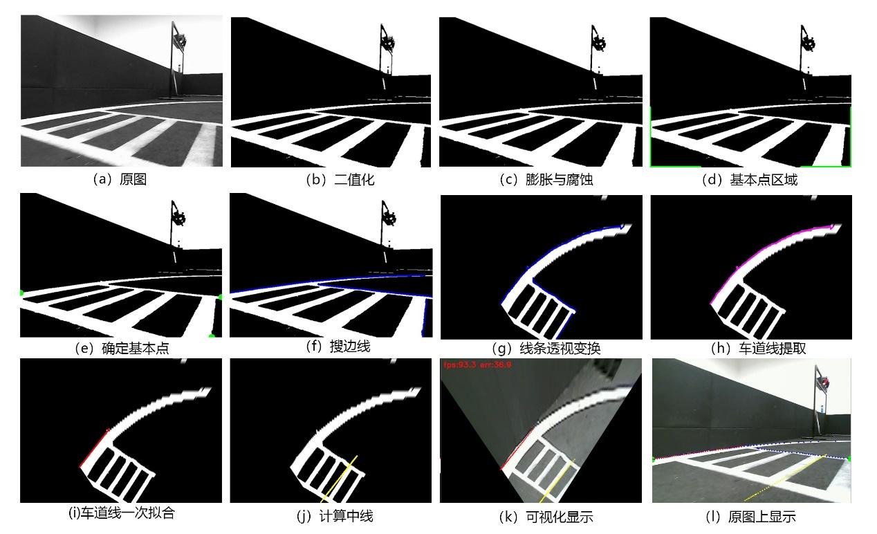 在本次比赛中,车道线的识别也是本次比赛的一个难点,无人车上USB camera的位置低、视角窄导致大部分时间只能看到单线,再加上工控机的性能较弱,对图像相关处理速度较慢。对于车道线识别,我们没有采用比赛方提供的例程,而是从实际驾车思路出发,想办法得到道路的中线,通过中线推算偏差。