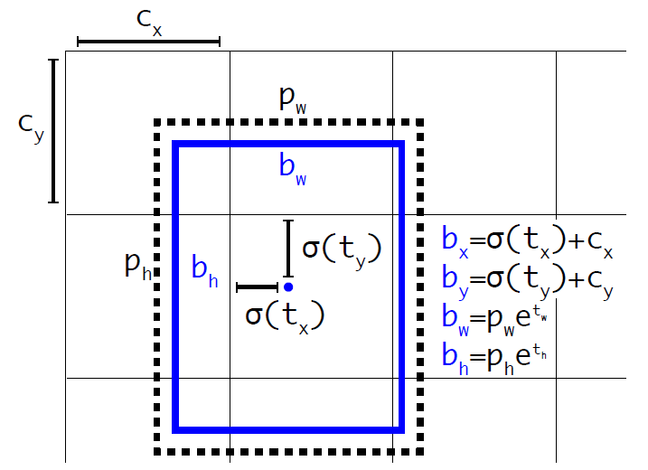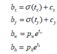 y1、y2、y3中每个cell回归边界框预测4个坐标,tx , ty , tw ,th。如果目标cell距离图像左上角的距离是(cx ,cy),且它对应边界框的宽和高为pw , ph ,如图3‑7所示,那么网络的预测值为: