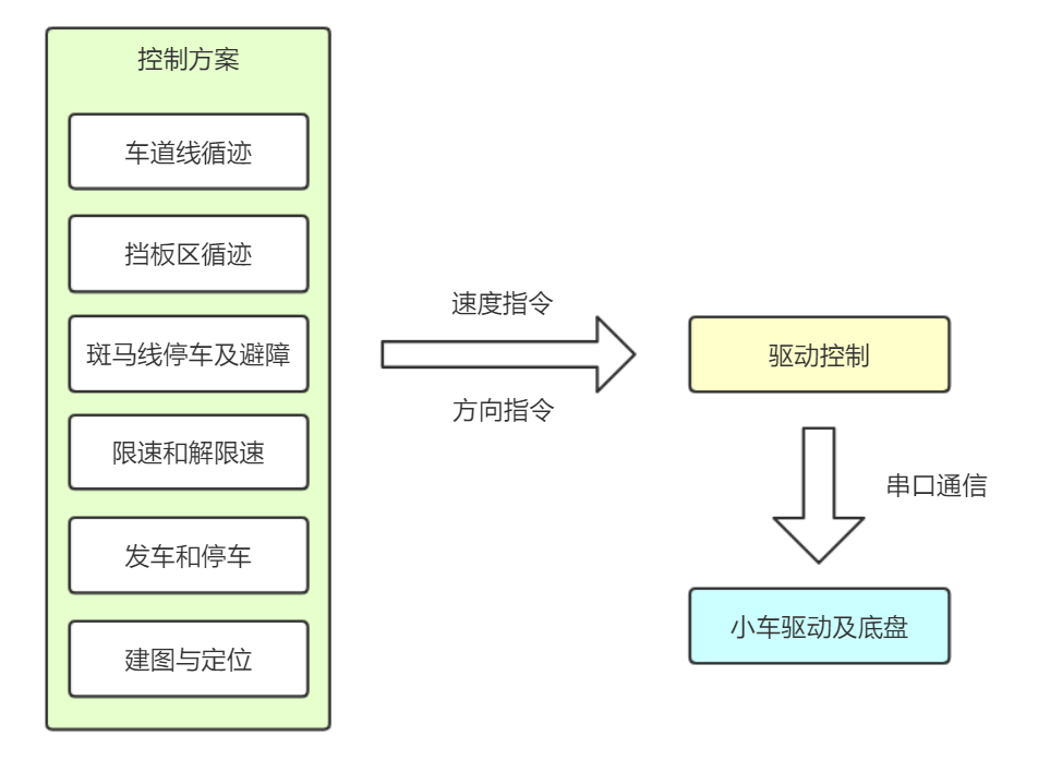 无人车上由车上的工控机完成各项数据的处理和融合,进行无人车的决策控制。通过处理激光雷达的点云数据,做Slam建图和运行中的实时定位以及挡板区的循迹,处理USB摄像头的采集的车道线数据,做车道线的识别,通过Socket通信接收来自HiLens kit的目标检测的结果。如图5‑1所示,无人车的控制方案主要包括:车道线循迹、挡板区循迹、斑马线停车及避障、限速和解限速、发车和停车、建图和定位,通过ROS整合各个节点的消息,将多种数据进行多模态融合,进行无人车控制状态机的切换,给驱动控制发送不同的速度和方向指令,驱动控制将速度和方向信息转为无人车底盘的电机速度和舵机打角指令,通过串口发送给无人车驱动,最终实现无人车完美高效地完成整个比赛任务。