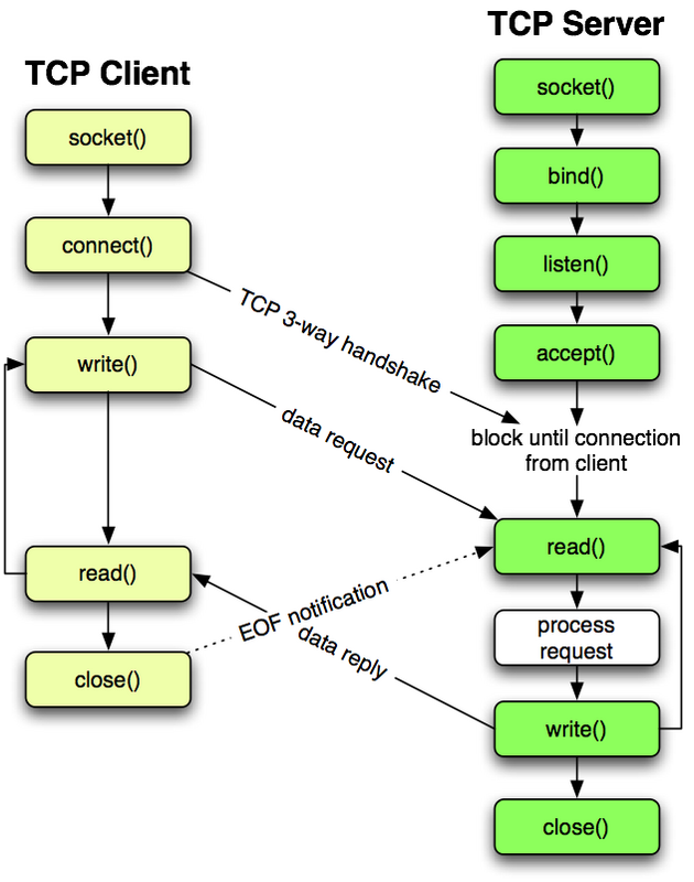 在无人车比赛中,HiLens Kit通过网口采用Socket通信与工控机或PC机进行通信,Socket网络通信框架如图4‑5所示,Socket是应用层与TCP/IP协议族通信的中间软件抽象层,它是一组接口。