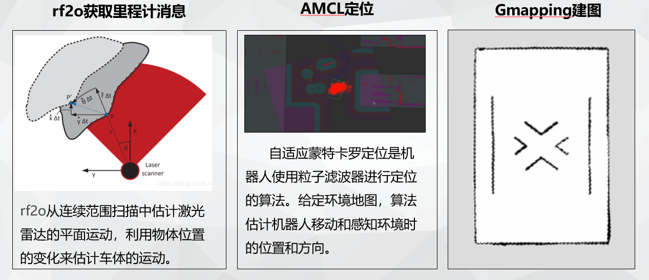 无人车Slam建图和定位的方案,现已经很成熟, GitHub、GitLab等开源平台也有很多非常棒的基于ROS的激光雷达Slam项目和定位方案,我们采用开源的rf2o将激光雷达数据转为里程计信息,通过AMCL做定位,采用Gmapping建图,ROS开源社区(http://wiki.ros.org)都有详细的介绍,此处不再赘述。