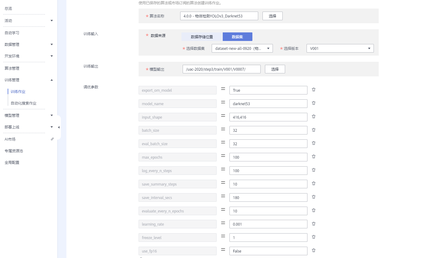 在ModelArts中做模型训练和调优参数相关设置如图3‑8所示,使用ModelArts中可视化工具做训练过程可视化结果如图3‑9所示。模型训练完成后,通过在线的模型转换工具,转换为.om的模型,以供在HiLens Kit上做推理。