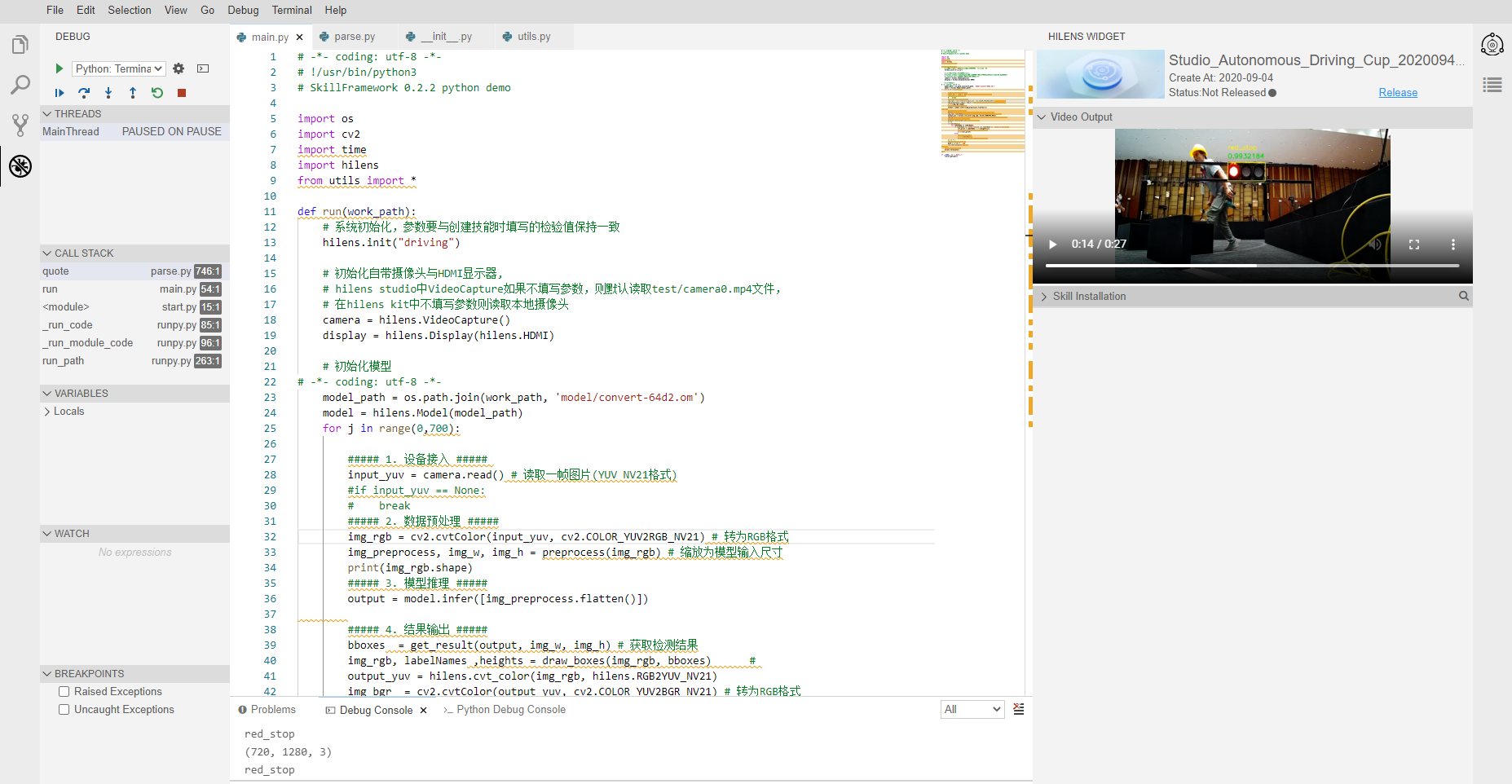 在做检测任务的技能开发,我们首先利用HiLens Studio的开发环境和HiLens Framework,在线做模型前向推理的测试,HiLens Studio开发环境如图4‑4所示,代码流程如图4‑3所示,先初始化HiLens、摄像头和加载模型,接着进入循环,读取摄像头采集的图像,做数据预处理,HiLens读取摄像头的图像为YUV格式,需要转为RGB格式,以及将图像resize为(416,416),以便做模型推理。模型推理通过调用HiLens Framework封装好的API,做模型前向推理的计算。由于Ascend310不支持模型后处理的计算,所以这一部分需要通过软件来做,后处理主要包括,从模型输出的特征矩阵中解码出检测框的位置、类别、置信度等信息、NMS筛选检测框等,最后输出结果。在结果后处理阶段,我们也加入了一些小技巧,以提高检测任务的准确率: