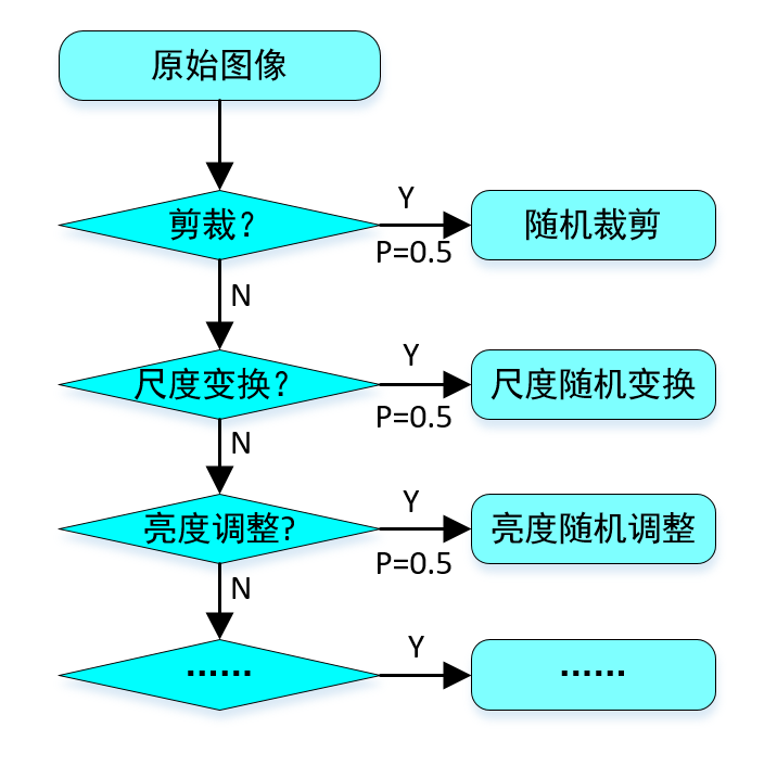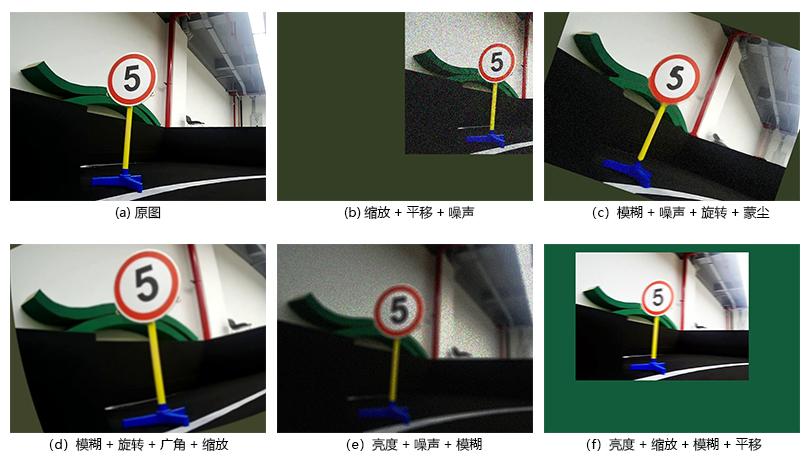 该项目对于数据的扩充采用颜色空间变换、模糊、亮度调整、黑白、压缩、随机噪声等30余种数据扩充办法。由于我们比赛中要识别的对象,颜色是很重要的一个特征,例如:红灯、黄灯、绿灯三种灯的颜色,限速标识的红色和解限速标识的黑色,颜色变化相关的数据扩充,会造成数据颜色特征的丢失。红灯、黄灯、绿灯三种灯分别在左、中、右三个位置,交通灯亮的位置,也是区分三种灯的很重要的特征。所以对数据集的扩充,去掉了色彩变换和水平翻转的数据扩充办法。数据扩充采用扩充方法级联的方式,如图3‑4所示,更大程度上,减小数据之间的相似性,增加图像数据的多样性,数据增强的效果如图3‑5所示。