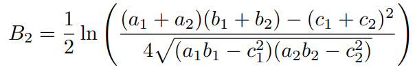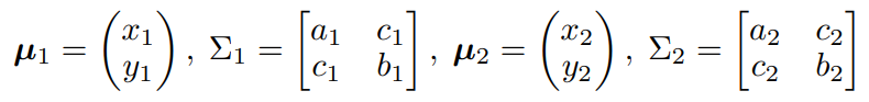 当 p ~N (μ1,Σ1), q~N (μ2, Σ2 ) 且目标检测中实际问题为2维向量及矩阵,巴氏距离 BD 可通过如下公式进行计算:
