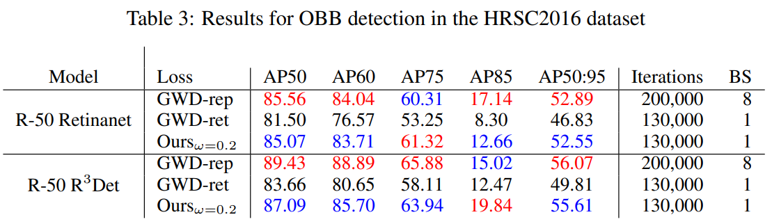 将基于 ProbIoU 的损失函数用于OBB 检测任务中, 分别采用 R-50 Retinanet 及 R-50 R3Det ,在 DOTA v1 及 HRSC2016 数据集进行训练。如下表所示,在 DOTA V1 数据集,采用 Retinanet 模型时,基于 ProbIoU 的 损失函数 AP 比 GWP-ret 高 2%;采用 R3Det 模型时, 其结果与GWD-rep 和GWD-ret 接近。在 HRSC2016 数据集上,基于 ProbIoU 的损失函数结果与GWD-rep 相当, 并且优于GWD-ret 。