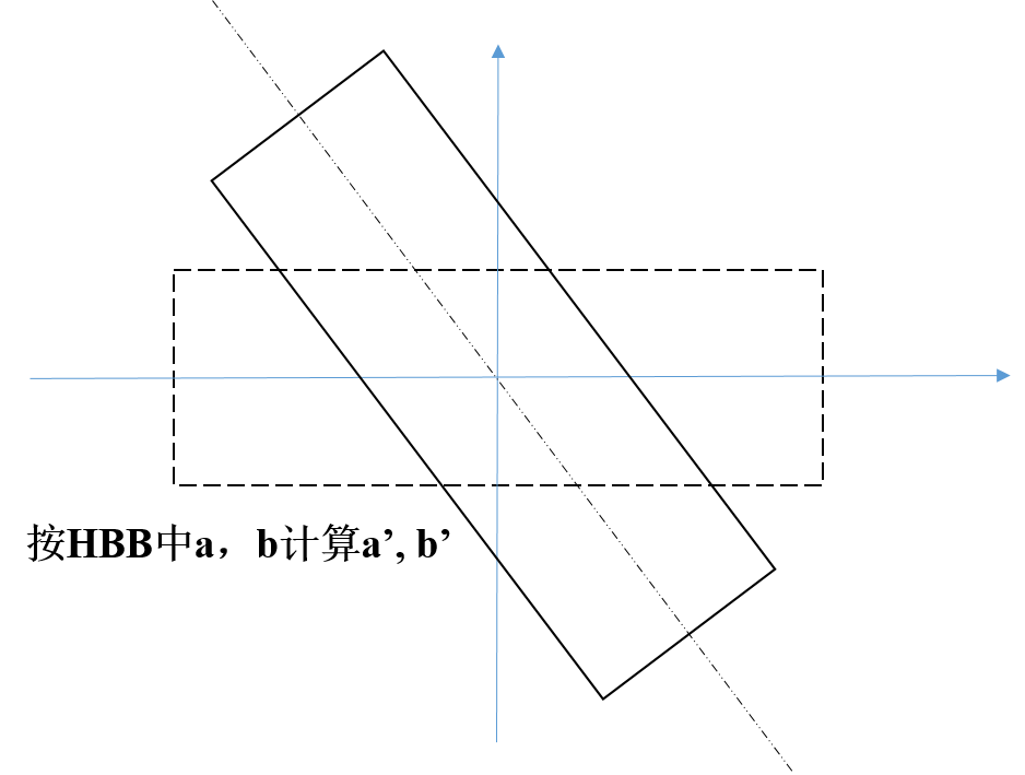 OBB 转化为 GBB 需要计算 (a ’,b ’,θ),如下图所示,方差 a ’和b ’ 可通过将旋转框转化为水平框进行计算, 其协方差矩阵可通过下列公式进行计算。